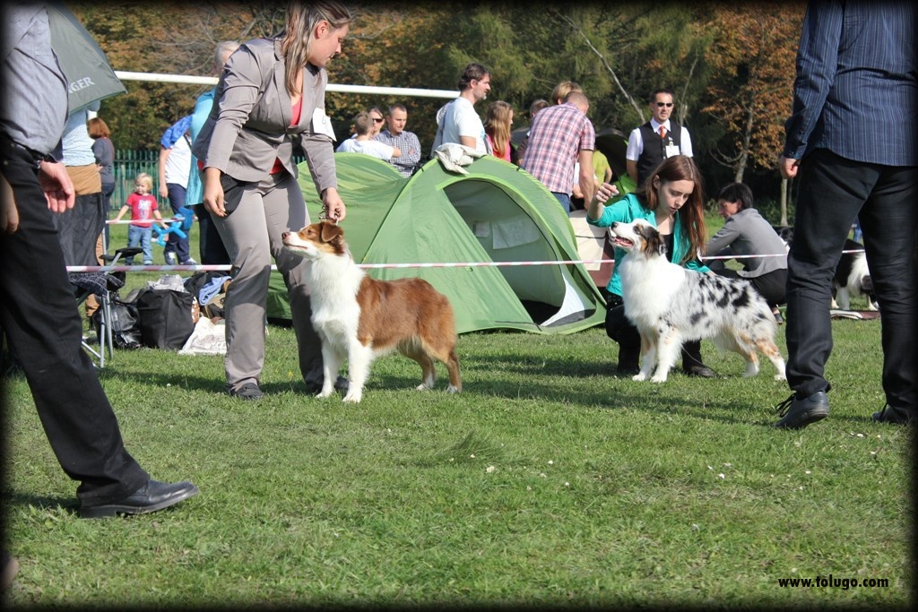Ausíci začali a já sledovala na co se klade důraz a co se naopak nelíbí. Po jednom štěňátku nastupovali psi v mezitřídě, kde byli tři v konkurenci. Sama pro sebe jsem si udělal pořadí a čekala, jestli se shodnu s verdiktem rozhodčího. Psi se posuzovali opravdu důkladně, vlastně je prosahali 3 lidi a debatovali o tom, který je takový a který makový. Také důkladné posouzení v pohybu, které myslím mnohdy rozhodlo o vítězi. V otevřené import z USA, jemuž konkurent nedorazil a tak si odnáší CWC a po chvíli zaslouženě také titul nejlepšího psa v plemeni. Pak už není moc času, protože po jednom štěňátku a jedné dorostenkyni nastupujeme do kruhu s Kiwi. V konkurenci máme blue merle fenku, její maminka import USA, otec nádherný "Simon" Wind Spirit Nobody Does It Better ze Španělska. Jelikož Kiwi už jedno čekatelství na polského junior šampionamá, chtěli jsme samozřejmě i tohle další. :-) Obhlídnutí obou fen ve statice, potom v pohybu, samostatné posouzení, prohlídka zubů, ode mě ke mě a opět se běhalo společně. Dvě kolečka, porada všech tří rozhodčích a prvenství putuje k nám. Jupíííí! Náš cíl splněn, domů můžu odjíždět spokojená. Jelikož žádný mladý pes nebyl přihlášen, titul za nejlepšího mladého v plemeni putuje automaticky na Lučinu, tedy k nám. :-)