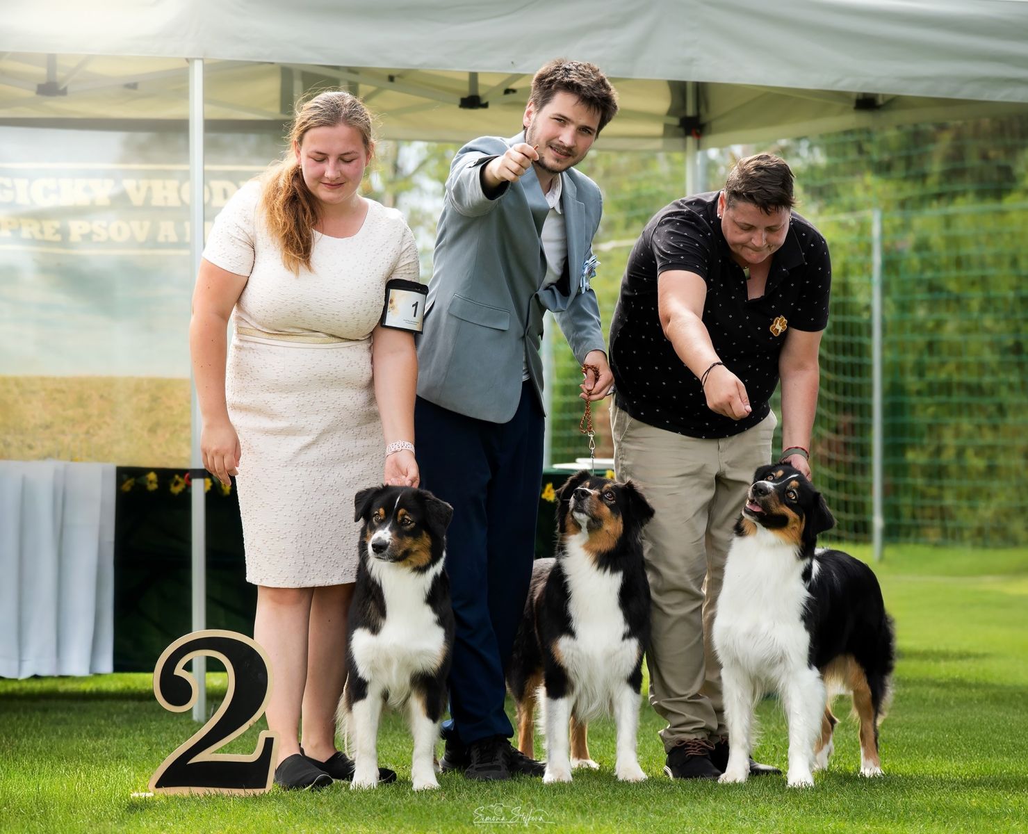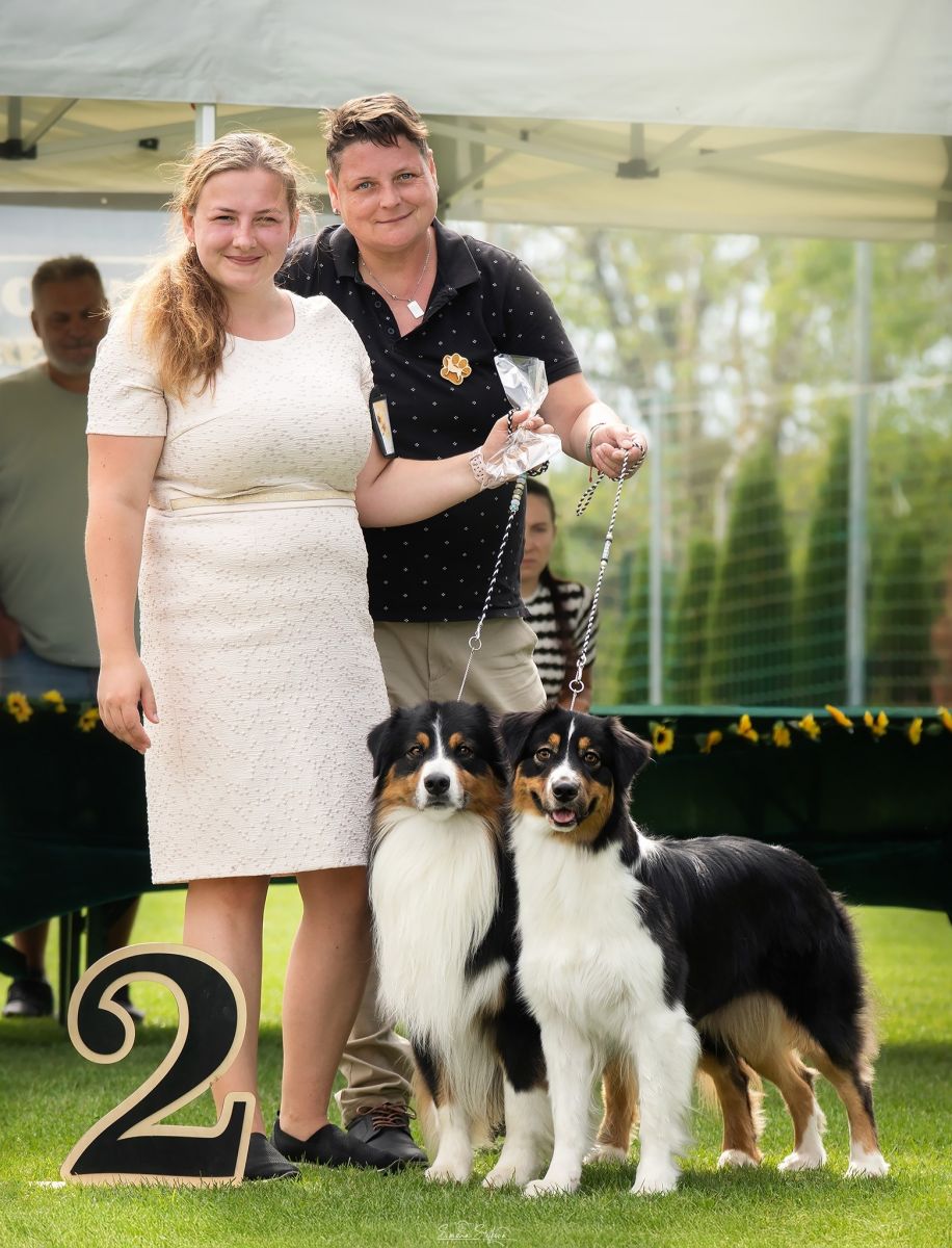 I s aussíky jsme se proběhli v párech. Já vedla Diesela a Janča Crashu. Myslím, že nám to celkem šlo a i nám to slušelo, tak si odnášíme krásné 2.místo ze 4 párů. Přihlásili jsme i chovatelskou skupinu. Já běžela s Bai, Peťa s Popelkou a Janča s Crash a získali jsme ze 4 skupin taky 2. místo.